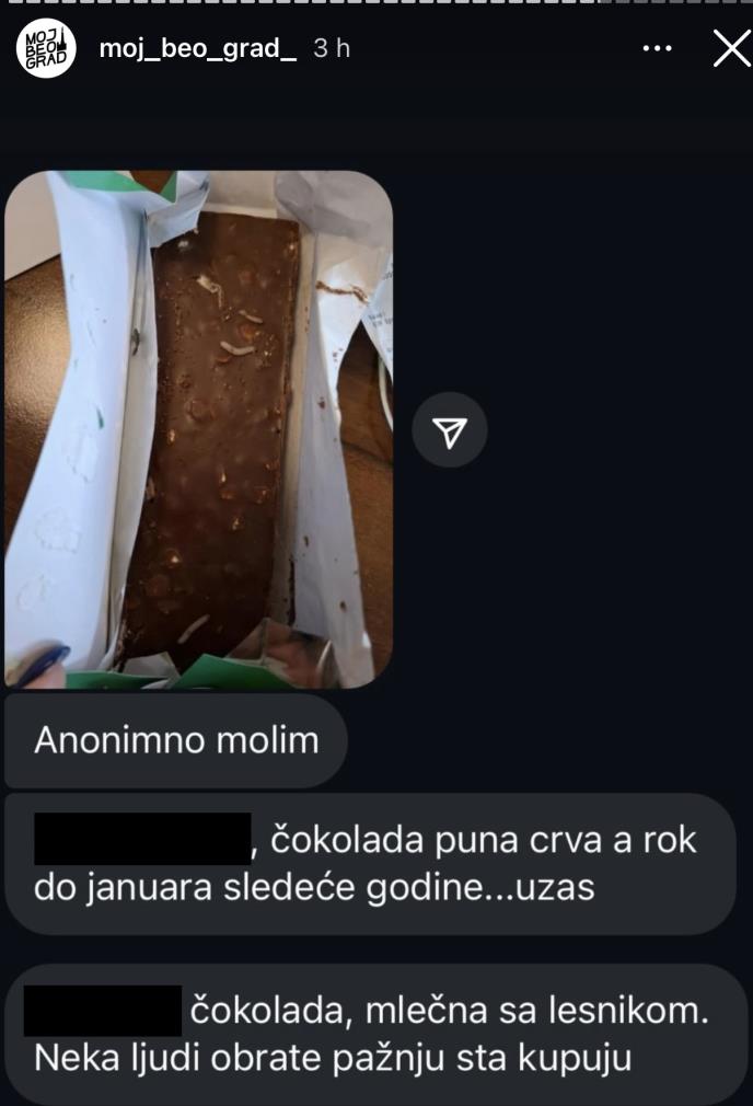 Beograđanka je bila zgrožena prizorom, a kako bi upozorila druge, podelila je fotografiju na Instagramu, na stranici “Moj_beo_grad_”. Na slici je jasno bilo vidljivo kako crvi “nastanjuju” čokoladu, što je izazvalo reakcije mnogih korisnika koji su komentarisali slična iskustva. Potrošači često nemaju uvidu u to da neki proizvodi, iako još uvek nisu prošli rok trajanja, mogu sadržavati oštećenja, kvarenje ili druge nepoželjne elemente koji mogu ugroziti njihovu sigurnost.