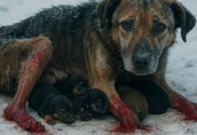 Pas bez šapa ležao je u snijegu, štiteći svoje štence… ali...