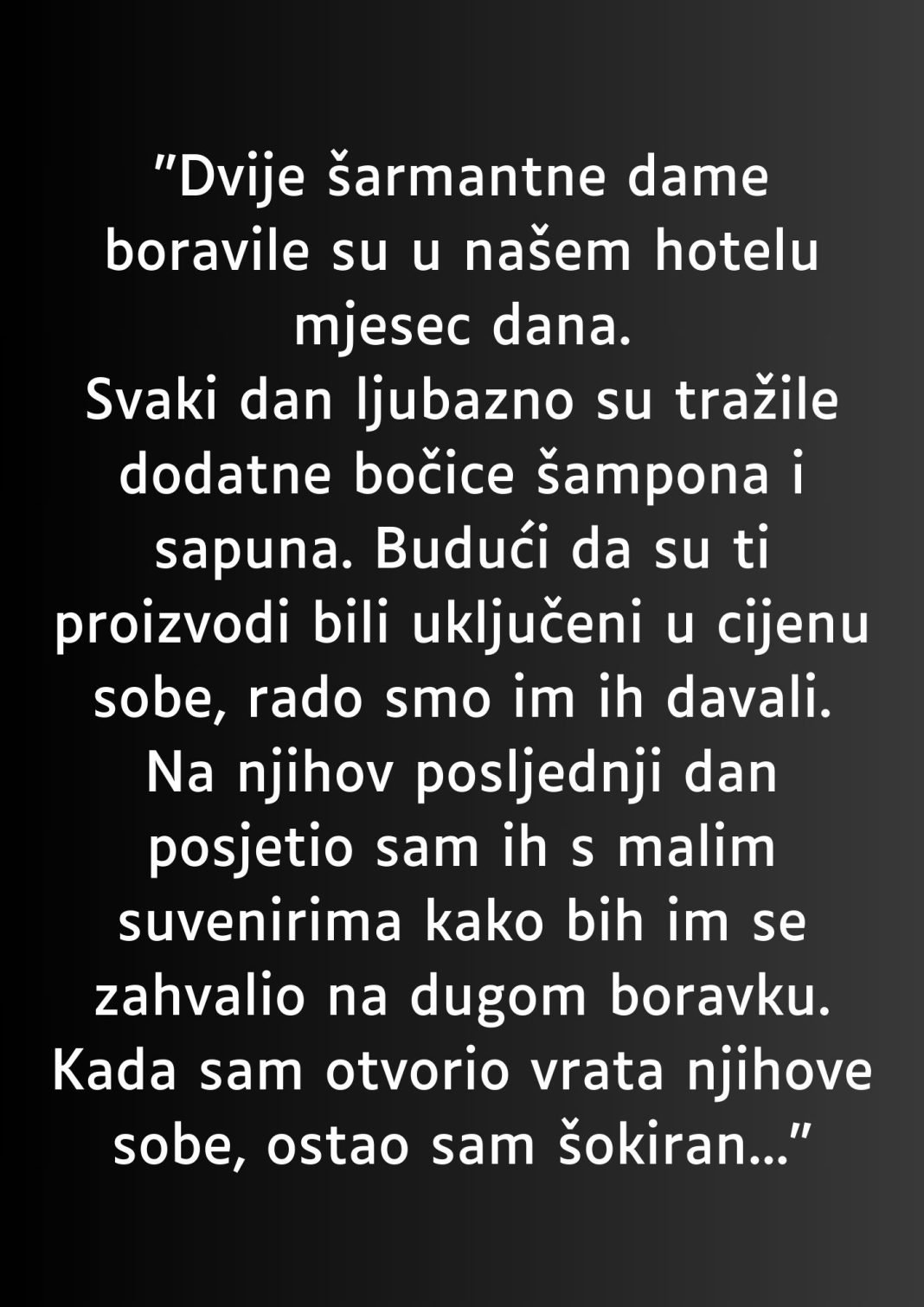 Svaki dan su ljubazno tražile dodatne bočice šampona i gelova za tuširanje, a pošto su ovi proizvodi bili uključeni u cijenu sobe, hotel nije imao razloga da im ih ne daje. Naizgled, ništa neobično u cijeloj situaciji.