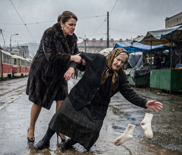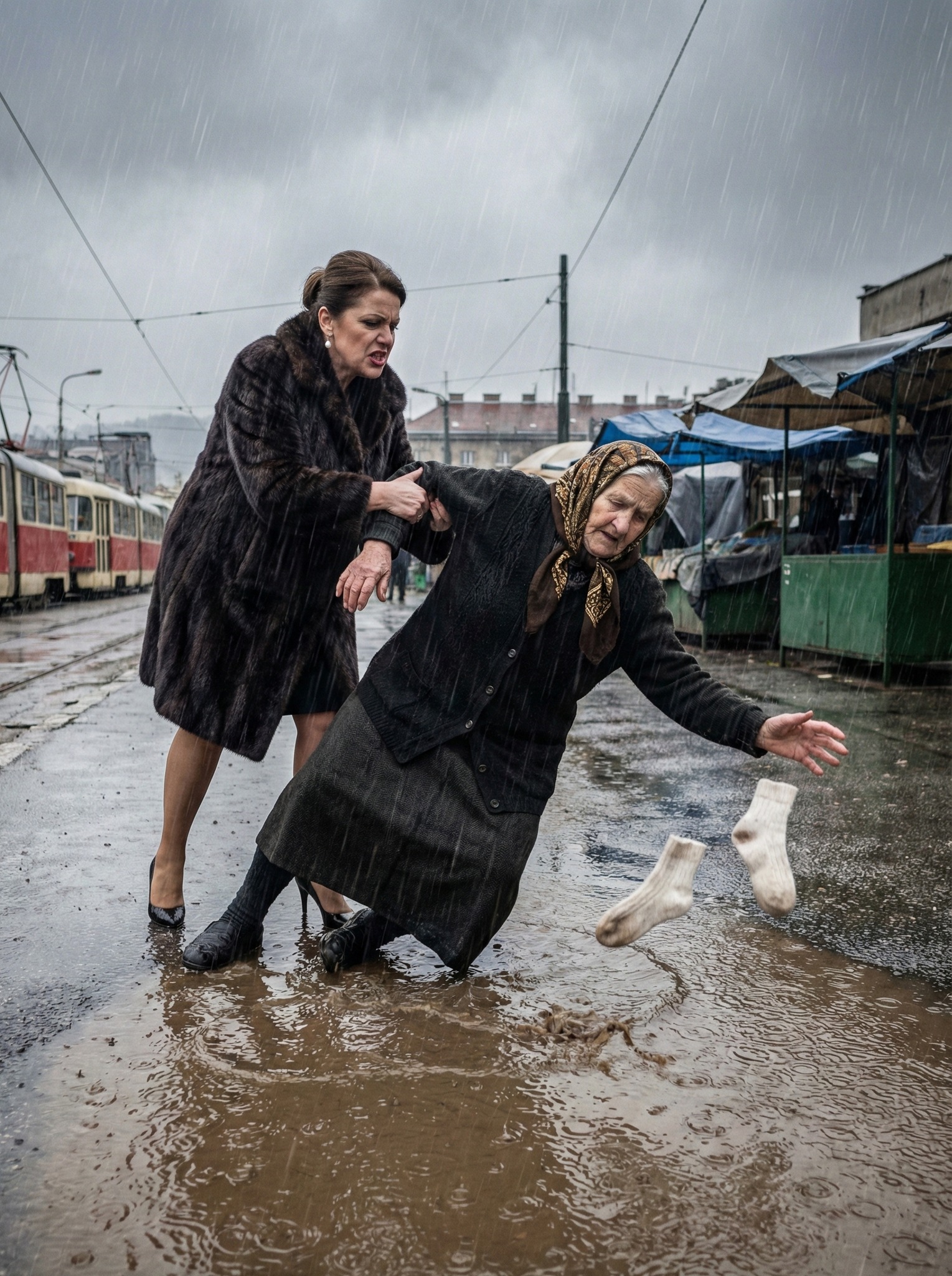 Tog dana je na pijaci bila i Selma, žena u skupoj bundi, u žurbi, sa telefonom na uhu. Njen sin Edin bio je na intenzivnoj nezi zbog teške upale bubrega, a ona je jurila da mu nabavi med i limun jer je verovala da će mu to pomoći. U svojoj nervozi i žurbi, nije imala strpljenja da saopšti svoje želje i izbijanje besa. Kroz pijacu je trčala, kada je naletela na Fatu. Starica je tiho nudila čarape, ali Selma, bez obzira na to, gurnula je i odgurnula je. U tom trenutku, Fata je pala u blato, a njene vunene čarape, jedini izvor zarade, bili su uništeni.