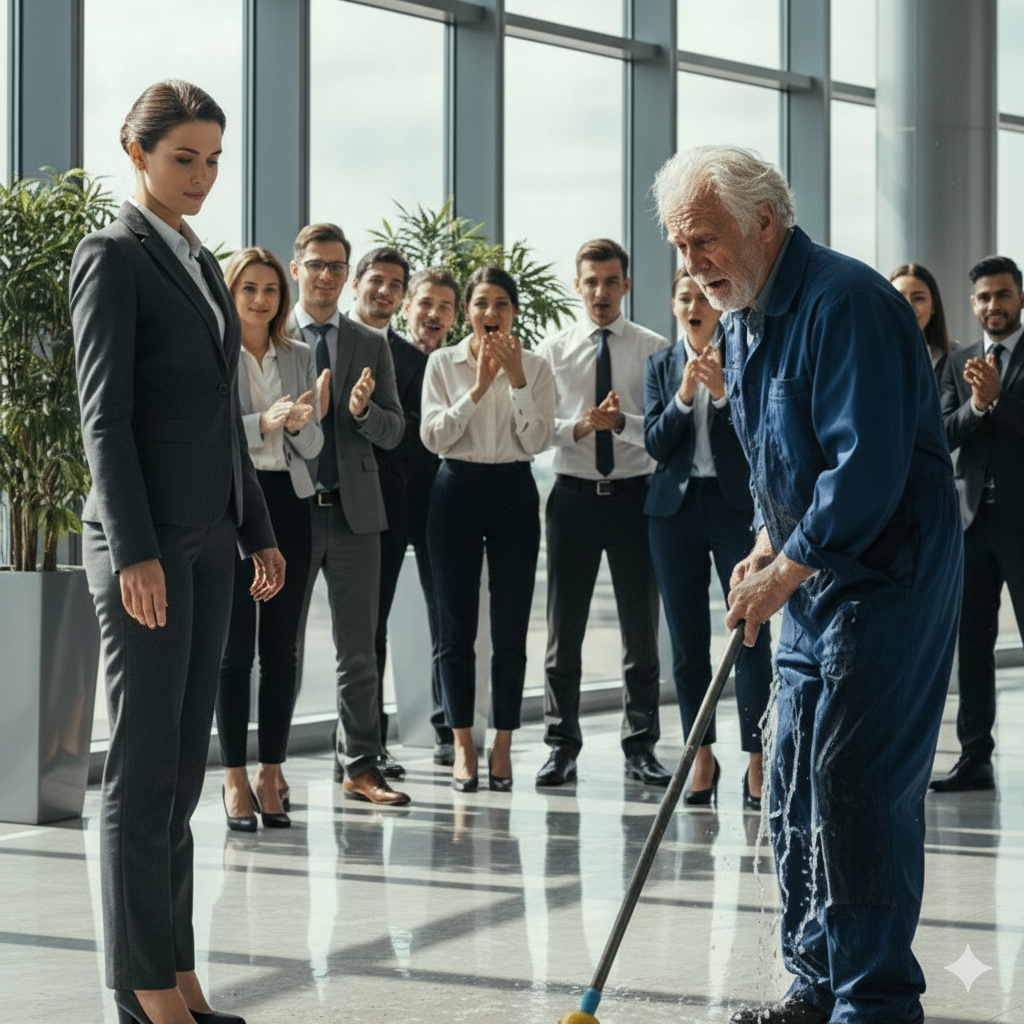 Nakon toga, Artur je odlučio da reši situaciju. Vratio se u svoju kancelariju, obuo svoje odelo i sazvao hitnu sednicu sa upravom. Kada je ušao u salu za sastanke, svi su stajali u tišini, zbunjeni njegovim izgledom. Na sto je postavio svoje naočare i žutu tablu „Klizav pod“, koja je poslužila kao simbol njegove transformacije od vlasnika firme u običnog radnika. Izgovorio je rečenicu koja je promenila sve: „Danas sam bio čistač u ovoj firmi, i video nešto što nisam mogao ni da zamislim.“
