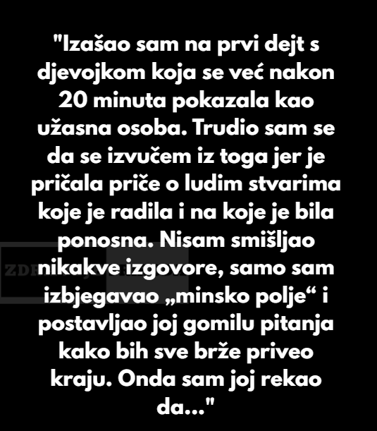 - Iako je pokušao sve kako bi izbjegao sukob i završio dejt na pristojan način, postavljao joj je pitanja, tražeći da razgovor što prije završi. Na kraju, odlučio je reći istinu. Rekao je da se ne osjeća povezano i da je najbolje da odmah odu jer ne žele gubiti vrijeme jedno drugome. To je bila iskrena reakcija, jer nije želio da situacija postane neprijatna niti da glumi nešto što nije. Nije bilo nikakvih izgovora, samo iskrena želja da se sve završi što prije.