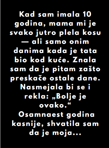 I tek tada, kad sam bila odrasla, počela sam shvaćati duboko značenje tih malih, svakodnevnih rituala. Mama je plela moju kosu kako bi zadovoljila očevu potrebu za pravilima, ali kad je tata bio odsutan, dopustila je sebi i meni da dišemo lakše, bez stresa i pritiska tih strogih zakona. Kuća je tada mirisala na slobodu, na opuštenost i tišinu. Pletenice koje je pravila nisu bile samo frizura, one su bile simbol njezine želje da zaštiti moj svijet od svega što je moglo biti previše zahtjevno ili strog.