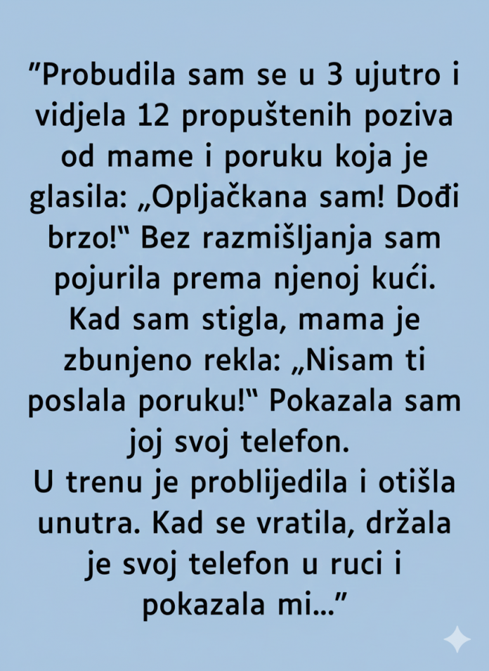 Kada je konačno stigla, vrata su bila otključana, ali unutra nije bilo tragova panike ni provale. Majka ju je zbunjeno pogledala, ne razumijevajući zašto je kćerka upala u kuću gotovo bez daha. Kada joj je pokazala poruku, majka je odmah rekla da je ona nije poslala. U njenom telefonu postojala je samo poruka koju je napisala, ali nikada nije pritisnula “pošalji” – poruka koja je sadržavala samo upozorenje o pljačkama u njihovom kraju. Tog trenutka žena je osjetila hladnoću niz kičmu. Ako poruka koju je ona dobila nije bila od majke, odakle je stigla? I zašto bi neko slao tako nešto usred noći?