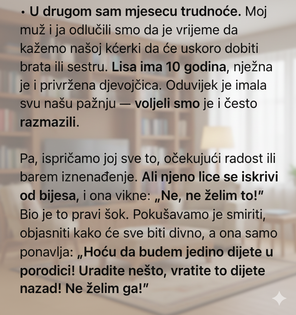 Međutim, stvar nije išla kako smo zamišljali. Lisa je reagirala potpuno neočekivano. Njeno lice se iskrivilo od bijesa, a onda je glasno povikala: „Ne, ne želim to!” Bilo je to pravo iznenađenje za nas, jer nismo mogli ni zamisliti da bi ona mogla reagirati na taj način. Pokušavali smo je smiriti, objašnjavali joj kako će sve biti divno i kako će uskoro imati brata ili sestru s kojom će se igrati i dijeliti sretne trenutke, ali sve je bilo uzalud. Ona je samo ponavljala: „Hoću da budem jedino dijete u porodici! Uradite nešto, vratite to dijete nazad! Ne želim ga!”