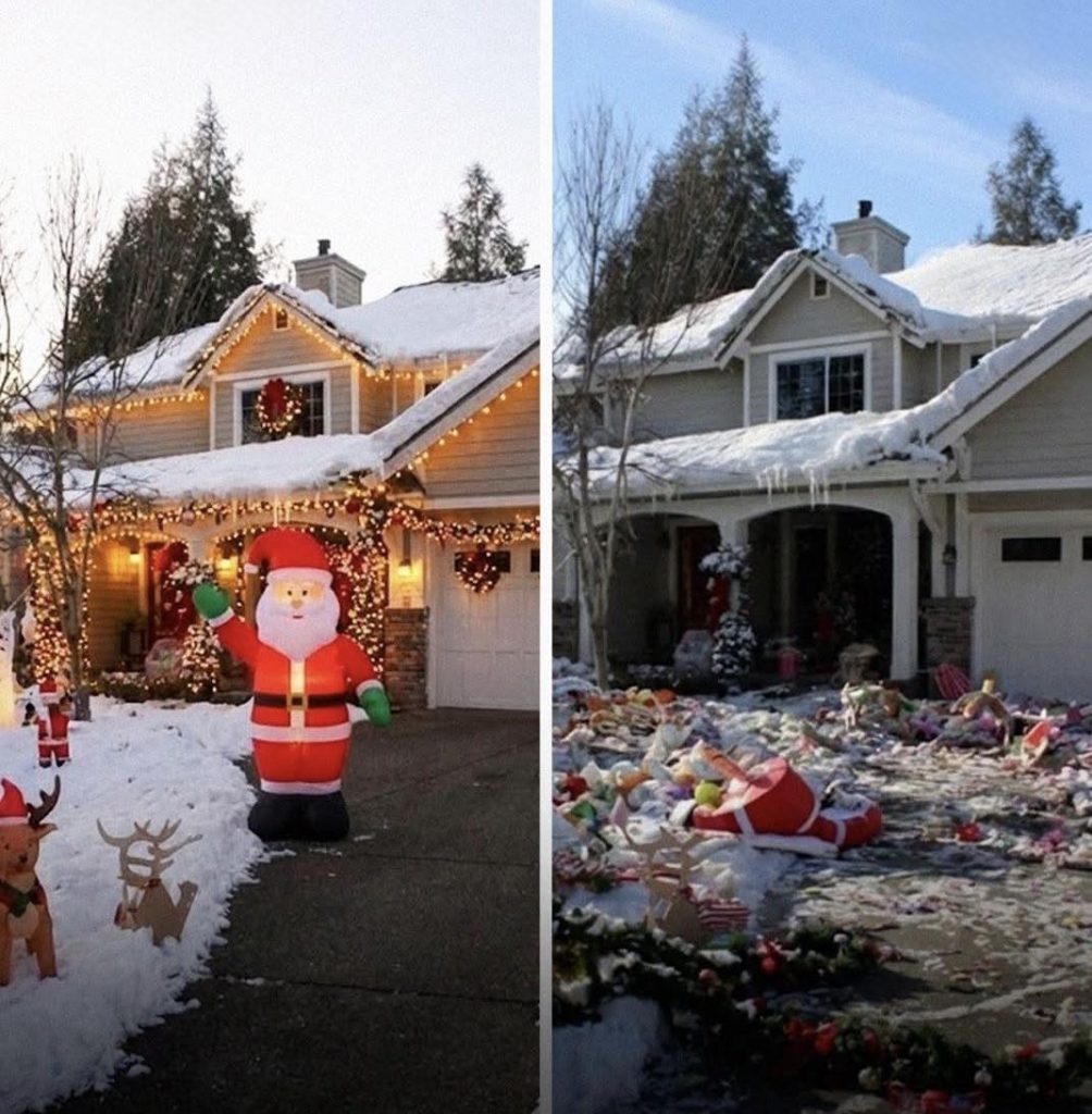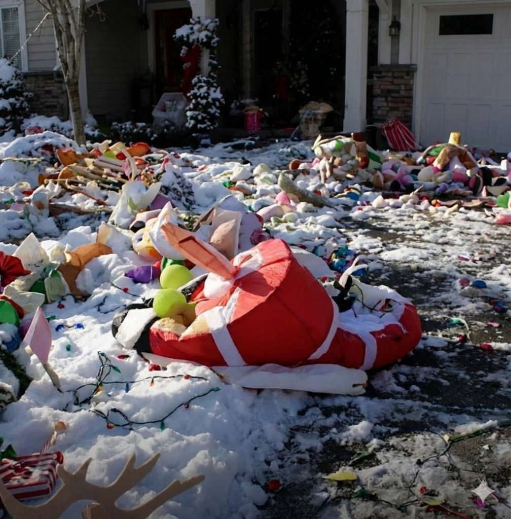 Međutim, sljedeće jutro, kada je žena otvorila vrata prema dvorištu, doživjela je šok. Svi ukrasi, svi trud i sav rad — bili su UNIŠTANI. Deda Mraz je bio rasporen, girlande su bile poderane i razbacane po blatu, a irvasi su bili slomljeni. Nije bilo sumnje, ovo nije bila nesreća, već čin namjerne destrukcije. Srce joj je ubrzalo, a misli su bile zbunjene. Djeca su već dotrčala i upitala što se dogodilo, a ona je znala da mora otkriti tko je odgovoran za ovo.