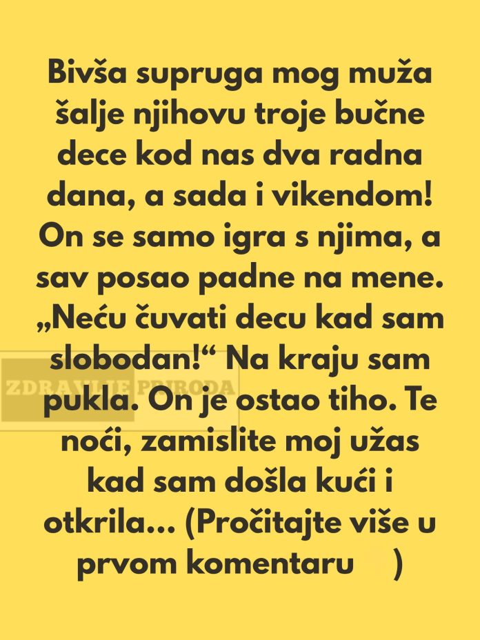 U centru ove priče nalazi se žena koja je ušla u brak vjerujući da će dijeliti dom, vrijeme i obaveze s partnerom koji je poštuje. Živjela je s mužem koji ima troje djece iz prethodnog braka, djeca koja, iako bučna i aktivna, nisu bila problem sama po sebi. Problem je nastao kada je njihova majka počela sve češće da ih šalje kod njih, ne samo radnim danima već i vikendom, bez dogovora i bez ikakvog osjećaja za tuđi ritam života.