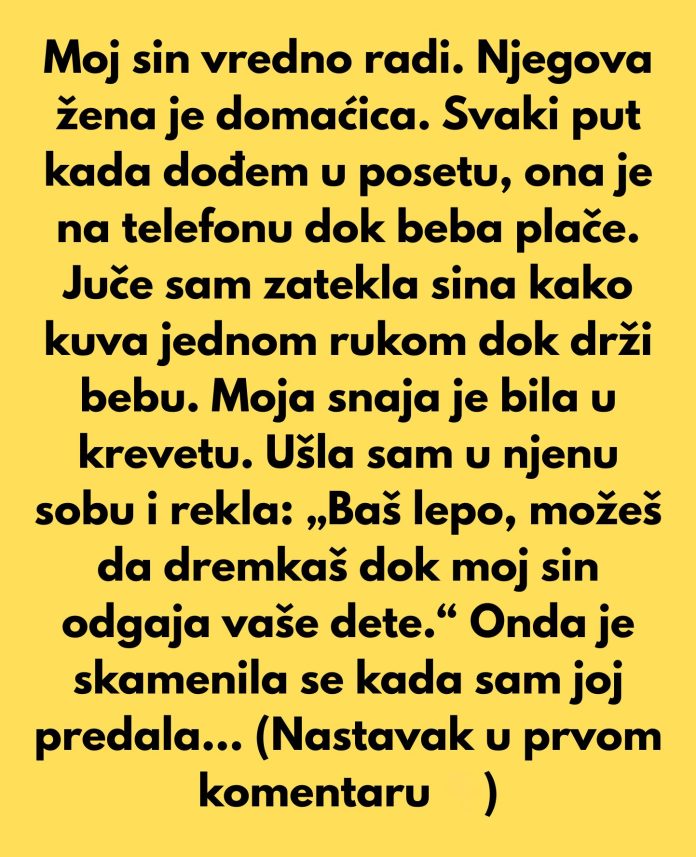 Majka nije mogla da se ne zapita: da li je bila preoštra ili je samo reagovala na pravi način? Njena želja je bila samo da njen sin prestane da se oseća kao da je uvek on taj koji mora da se bori i žrtvuje sve za druge, dok njegova žena, koja je kod kuće, ne preuzima odgovornost. Biti roditelj, a posebno svekrva, često znači postaviti granice, pa čak i kada se to čini teško, jer ljubav i zaštita porodice ponekad podrazumevaju i teške, ali nužne razgovore.