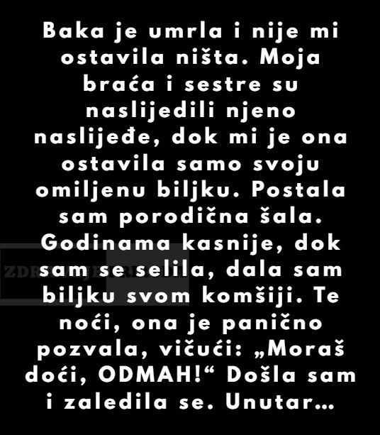 Kada je baka umrla, osjećala sam tugu koja se teško može opisati riječima. Bila je više od bake – bila je moj oslonac, moj dom, moja tiha učiteljica životnih vrijednosti. Zato sam bila potpuno zatečena kada sam saznala da mi nije ostavila ništa u oporuci. Moja braća i sestre naslijedili su sve – kuću, zemljište, štednju, porodično srebro. A meni? Meni je ostavila samo svoju omiljenu biljku.