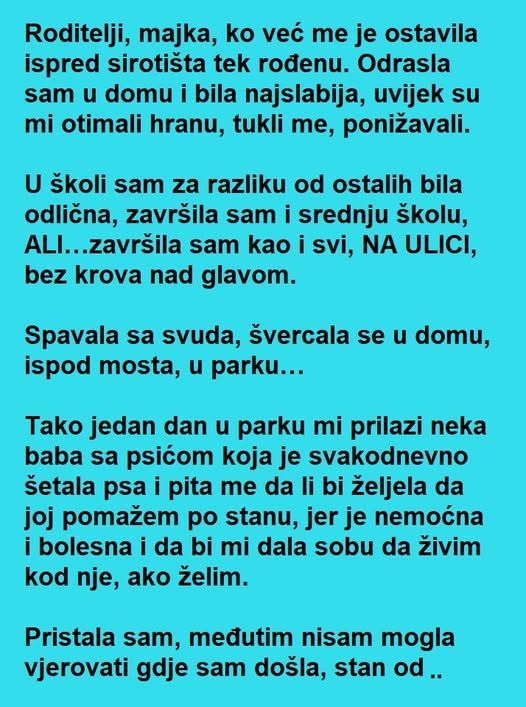 A onda je jednog dana – baka otišla. Tiho, bez patnje, ostavljajući za sobom prazninu koja se ne može popuniti. Kad je otvorila testament, suze su joj zamaglile pogled – sve je bilo ostavljeno njoj. Stan, dva poslovna prostora i značajna suma novca. Sve ono o čemu je nekada mogla samo sanjati, sada je imala. Ali nije osjećala sreću. Samo prazninu.