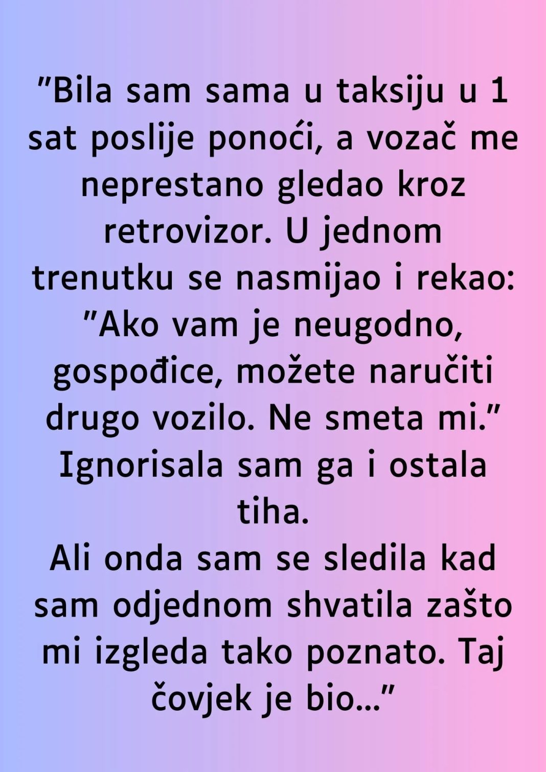 Bila je to obična noć, putovanje taksijem koje je trebalo biti rutinsko, ali se pretvorilo u nešto što će zauvijek ostati u njenoj memoriji. U trenutku kad je ušla u taksi, sve je izgledalo normalno. Vozač je bio ljubazan, a cesta je bila mirna. Međutim, ubrzo je postalo jasno da nešto nije u redu. Vozač je počeo neprestano gledati u retrovizor, što je mladoj ženi izazvalo nelagodu.