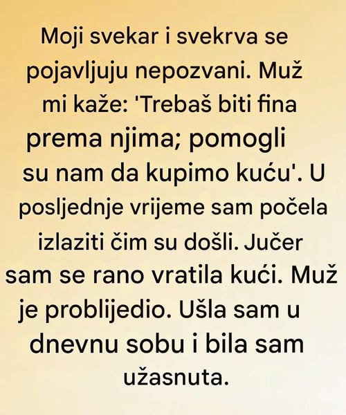 Moj muž je uvek govorio: „Budi strpljiva, pomogli su nam da kupimo kuću“, i naravno da sam bila zahvalna, ali sam se često osećala kao da smo izgubili svoj privatni prostor. Često sam izlazila iz kuće, odlazila na tržnicu ili šetnju, jer nisam želela da se suočim sa neprijatnošću njihovog prisustva. Ipak, to se promenilo jednog dana.