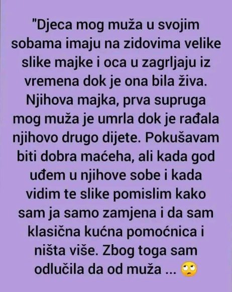 Svaki put kad uđem u te prostorije, osjećam kako mi nešto stegne grudi. Kao da hodam kroz tuđu priču u kojoj ja nemam pravo da budem glavni lik. Koliko god se trudila biti dobra maćeha – strpljiva, brižna, blaga – duboko u sebi osjećam da sam samo dodatak, zamjena koja je došla jer je sudbina bila nemilosrdna.