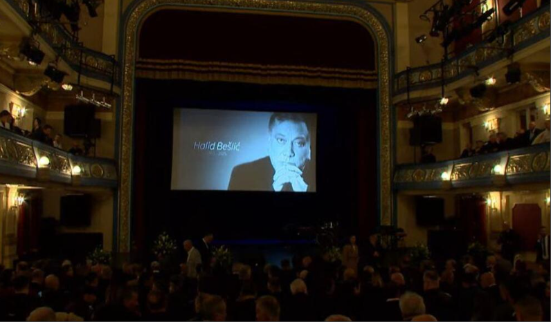 Komemoracija u Narodnom pozorištu počela je u tišini, ali sa ogromnim brojem ljudi koji su došli da isprate umetnika i čoveka. Sala je bila premala za sve koji su želeli da uđu, pa su ispred postavljeni video bimovi i stolice, a na njima beli ljiljani – simbol poštovanja i ljubavi. Sin Dino Bešlić došao je sa porodicom kako bi nadgledao da sve prođe dostojanstveno. Pored njega ostala je prazna stolica sa imenom njegove majke Sejde, udovice Halida Bešlića, koja nije prisustvovala. Taj detalj još je snažnije naglasio težinu trenutka i bol koju porodica nosi.