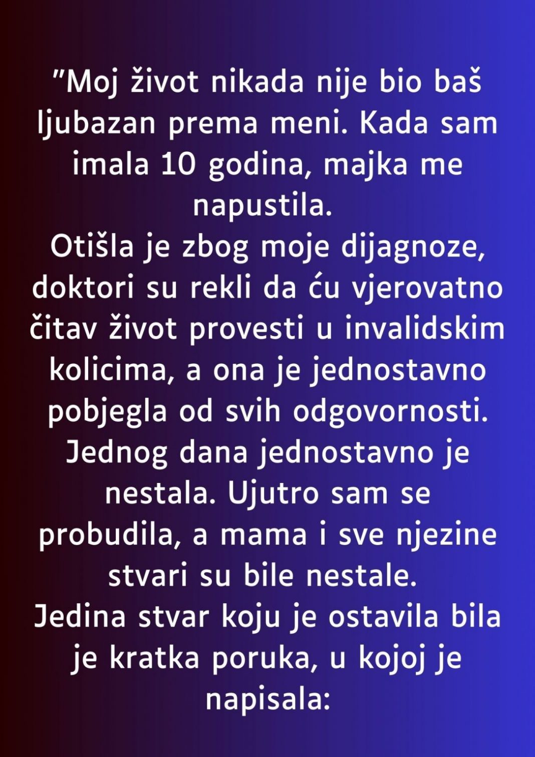Kada je imala samo deset godina, njen život se okrenuo naglavačke. U tom trenutku, kada je sve što je poznavao bilo njeno majčino prisustvo, ona je doživela gubitak koji je promijenio sve. Majka je otišla, a razlog za to bio je mnogo dublji nego što je bilo očigledno. Ljekari su joj dali dijagnozu koja je značila da bi mogla završiti u invalidskim kolicima do kraja života. Ta misao bila je previše za nju, a odluka da se povuče postala je, nažalost, njen odgovor. Niko ne može da shvati u potpunosti šta to znači za roditelja, ali ova priča pokazuje dubinu boli i unutrašnje borbe koju je majka nosila.