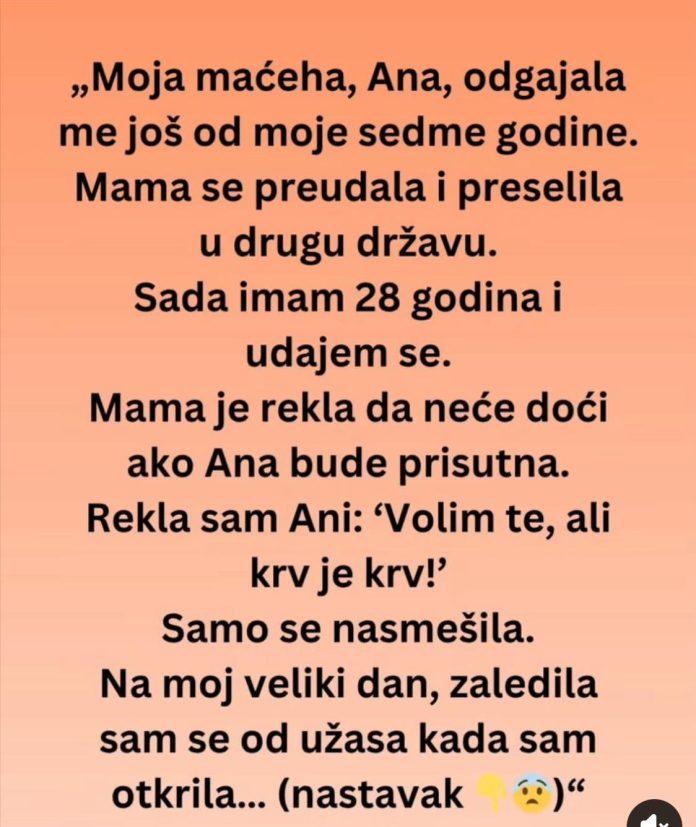 Na dan svog venčanja, devojka je bila potpuno zatečena kada je saznala da je Ana, njena maćeha, napustila dom i otišla, ostavljajući samo pismo. Pismo je bilo jasno: Ana više nije želela biti deo porodice jer nije osećala da ima mesto u njoj. To je bio trenutak prepun bola i tuge, trenutak kada je devojka shvatila da njena želja za očuvanjem porodične harmonije možda nije bila ispravna, a posledice njenog izbora bile su velike i nepopravljive.
