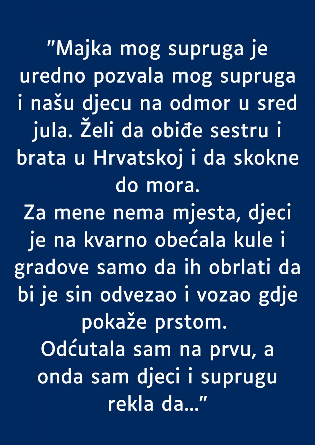 Međutim, vrlo brzo se ispostavilo da iza tih obećanja stoji mnogo manje iskrenosti nego što su svi prvobitno mislili. Iako je zvučalo kao savršen plan, majka njenog supruga je izostavila jednu vrlo važnu stvar – nije bilo mjesta za nju. Iako su svi znali da je to samo izgovor, ona je smislila plan da samo njen suprug i djeca idu, a ona nije bila dobrodošla. Čak je iskoristila i manipulaciju kako bi cijeli plan usmjerila prema onome što ona želi.