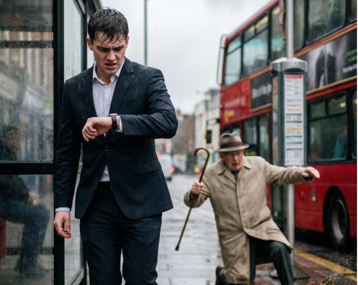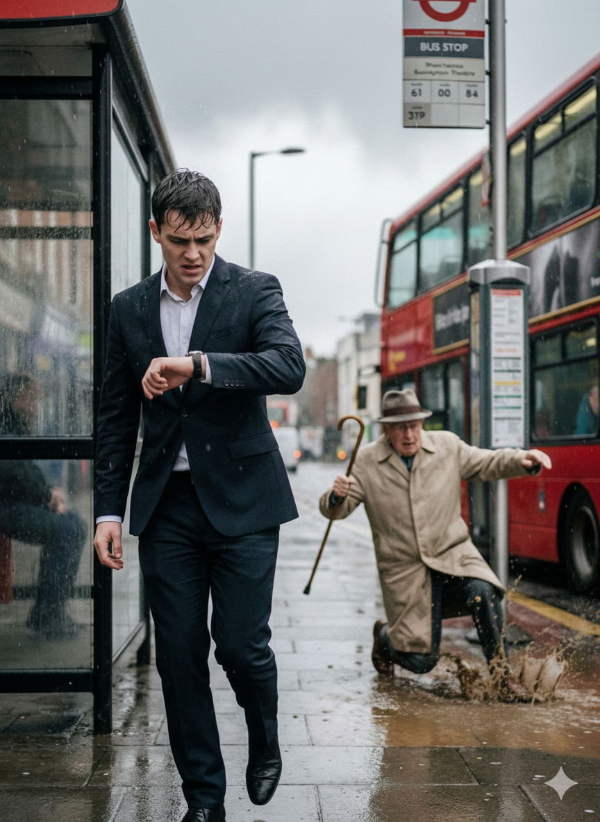 Dok je žurio na intervju, naišao je na starca koji se kretavao sporo, drhteći, oprezno silazeći sa stepenica autobusa. Marko je, nervozan zbog mogućeg kašnjenja, izgubio strpljenje. Umesto da sačeka trenutak, gurnuo je starca i posrnuo ga na blato. Bez kajanja, bez trenutka obazrivosti, nastavio je prema svom cilju, misleći da ništa ne može da ga zaustavi. On je bio taj koji je bio važan, sve drugo je bilo samo smetnja.