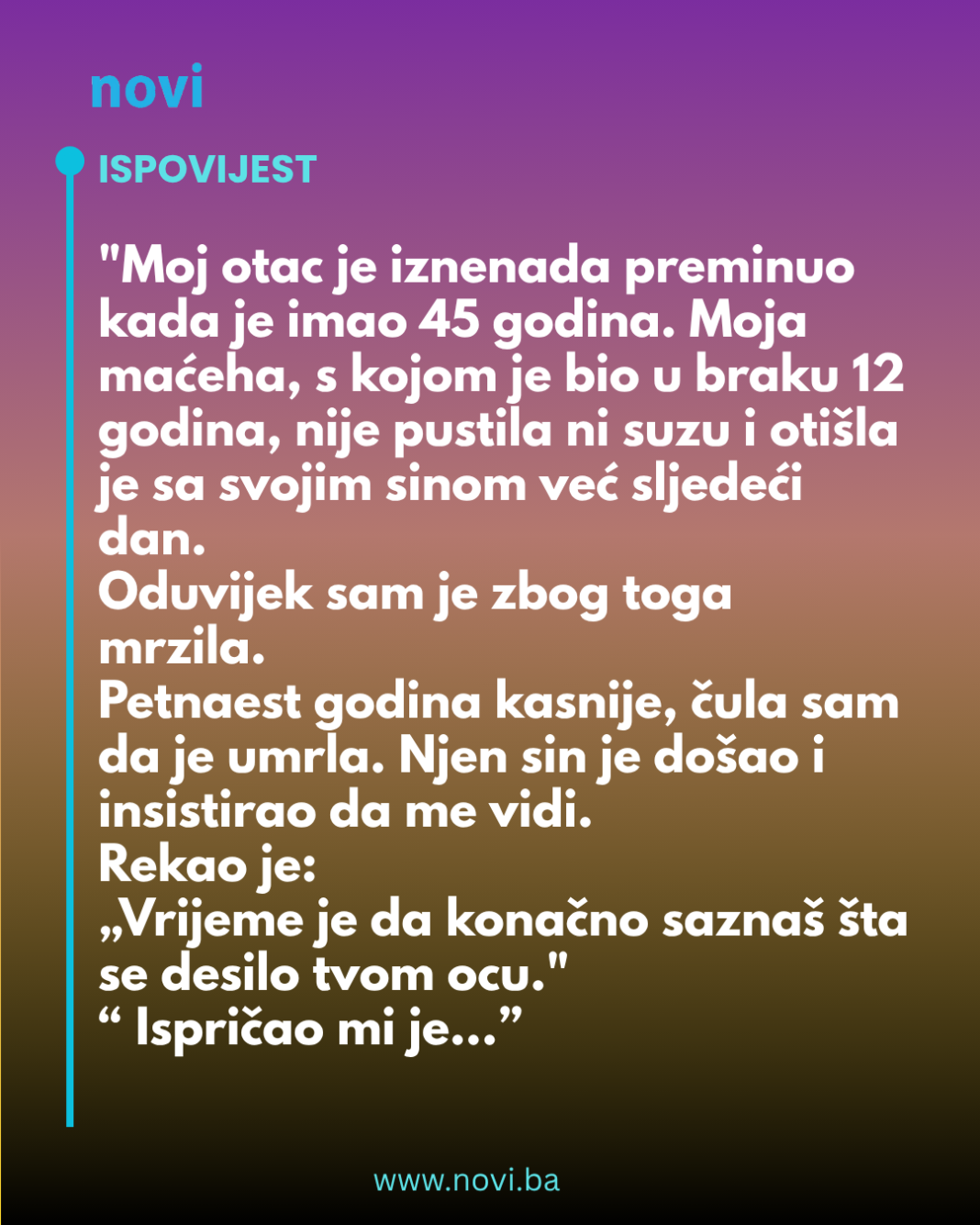 Ova ispovijest podsjeća da ono što vidimo nije uvijek ono što jeste, i da ljubav ponekad živi u tišini, skrivena iza pogrešno protumačenih postupaka.Žena koja dijeli svoju priču počinje s bolom koji je nosila dugi niz godina. Njen otac preminuo je iznenada, u 45. godini života. Taj dan promijenio je sve. Najviše ju je, kaže, boljelo ponašanje maćehe — žene koja, naizgled, nije pokazala ni trunku tuge. Nije zaplakala, nije se zadržala, nije rekla riječ. Samo je, zajedno sa svojim sinom, spakovala stvari i otišla iz kuće.