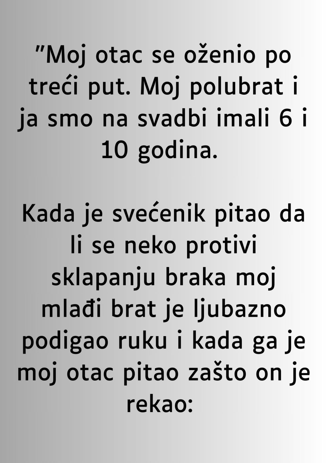 Kada je svećenik postavio tradicionalno pitanje — da li se neko protivi sklapanju braka — nastao je neočekivan trenutak tišine, i onda je mali dječak, onaj od šest godina, podigao ruku. U potpunoj nevjerici, otac ga je upitao zašto. A odgovor je bio toliko jednostavan i toliko snažan da ga niko u prostoriji nije mogao zaboraviti.