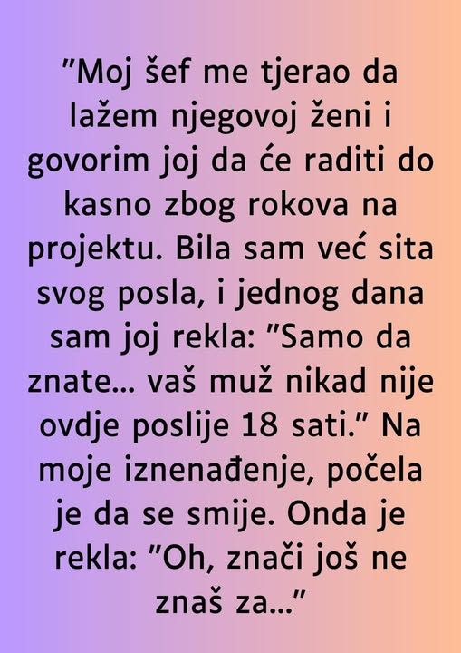 - I tako, jednog dana, više nije mogla izdržati. Otišla je do žene svog šefa i, potpuno iznervirana, rekla joj: “Samo da znate… vaš muž nikad nije ovdje poslije 18 sati.” Očekivala je da će žena biti šokirana, možda ljuta, ili barem zbunjena, ali ništa od toga nije uslijedilo. Na njeno iznenađenje, žena je počela smijeh. Zbunjeno ju je pogledala i rekla: “Oh, znači još ne znaš za našu malu igru?” Ispostavilo se da je cijela situacija bila test – šef ju je zapravo testirao kako bi vidio hoće li ikada reći istinu. Njegova ideja bila je da vidi koliko je ona zapravo lojalna, a njenu lojalnost je pokušao testirati upravo na ovaj način – manipulacijom i lažima.