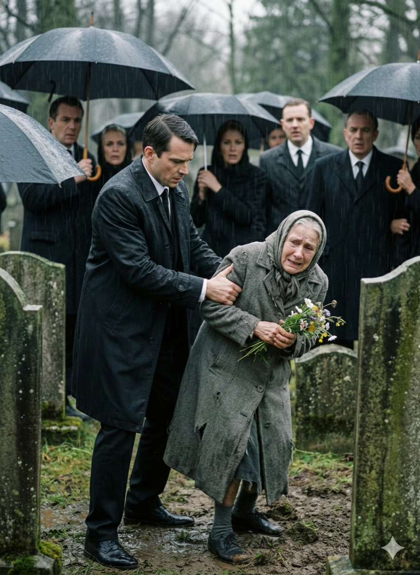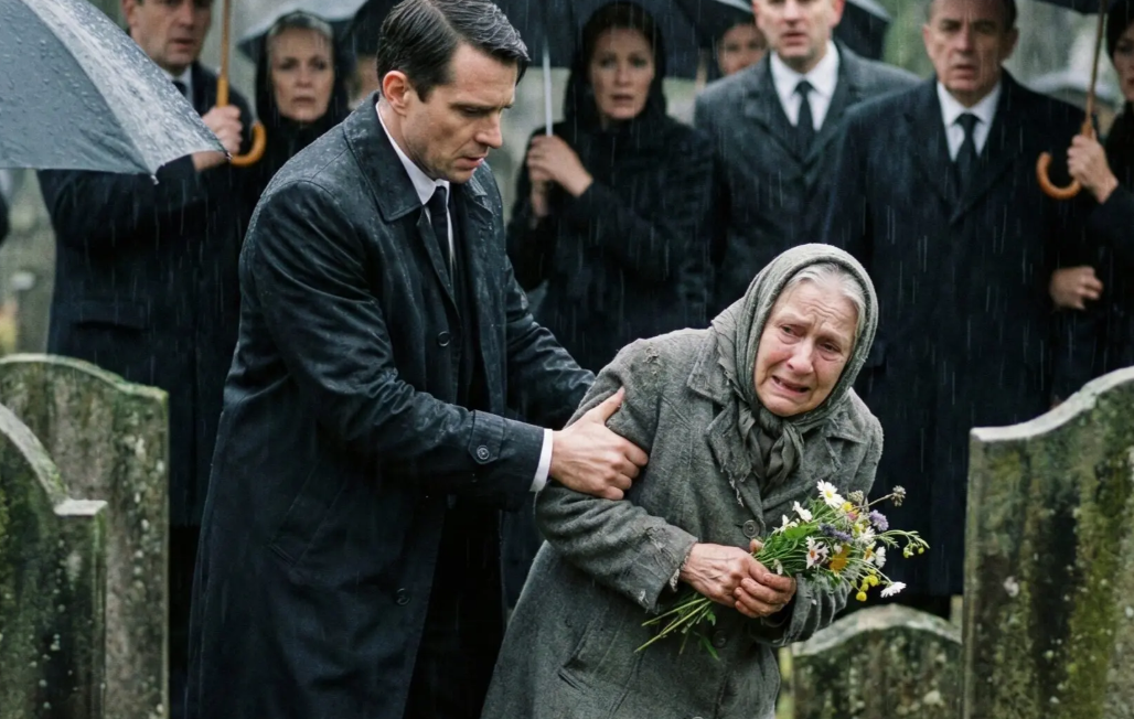 Međutim, scena se potpuno promenila kada je na groblje stigla žena koju niko nije očekivao. Starica, obučena u iscepani kaput i stare, vlažne patike, pojavila se pred okupljenim gostima. U njenim rukama bio je mali buket poljskog cveća, kojeg je verovatno ubrala s puta. Hodala je polako, sa puno poštovanja, ne obazirući se na prezrive poglede okupljenih. Kada je prišla sanduku i spustila skromni buket pored raskošnih venaca, Dejan je izgubio strpljenje. Osećao je sramotu pred svojim poslovnim partnerima, smatrajući ovu ženu kao neprikladnu osobu za takav događaj. Njegov bes izbio je u trenutku kada je počeo da viče na staricu, nazivajući je klošarkom i naređujući obezbeđenju da je izbaci.