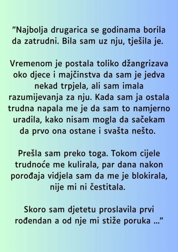 Nakon što je porodila sina, sve se dodatno pogoršalo. Shvatila je da ju je prijateljica blokirala na društvenim mrežama, a nije čak ni čestitala rođenje njenog djeteta. Taj trenutak je za nju bio ključan – shvatila je da je njihov odnos potpuno promijenjen i da je sve što su gradile kroz godine, nestalo pod težinom životnih okolnosti. Iako je osjećala gubitak, znala je da je došlo vrijeme da nastavi dalje, jer je život, kako to obično biva, donio mnogo više izazova i odgovornosti.