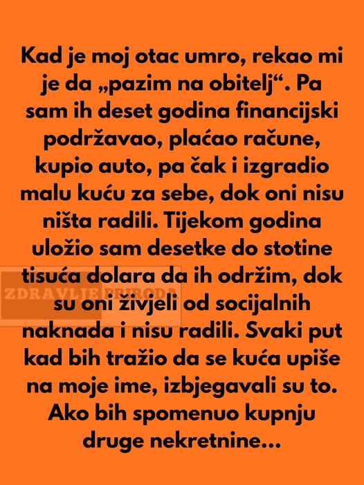 Kada mu je otac umro, dao mu je posljednji savjet: „Pazi na obitelj.“ I on je to shvatio doslovno. Godinama je plaćao račune, popravljao kuću, kupovao automobile, ulagao svoj novac i trud kako bi obitelj imala sve što im treba. Nije tražio ništa zauzvrat osim malo poštovanja i sigurnosti da ono što gradi – gradi i za sebe.