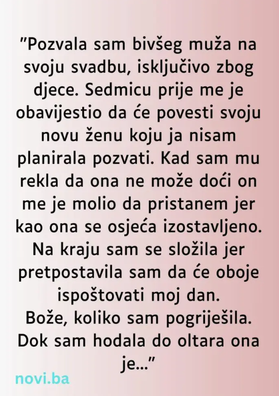 Na prvi pogled, čini se kao jednostavan i običan dan, dan kada je trebalo proslaviti jedan od najsretnijih trenutaka u životu. Međutim, za ženu koja je podijelila svoju priču, svadbeni dan je postao trenutak koji je ostavio gorak okus zbog nepoštovanja, nesporazuma i, nažalost, drskog ponašanja njenog bivšeg muža i njegove nove partnerice.