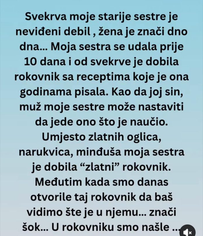 Nakon svadbe, svekrva je ponosno prišla mladoj snahi i uručila joj poklon. Svi su očekivali nešto simbolično, možda nakit ili neki vredan predmet, ali ono što je mlada dobila bila je zbirka – rokovnik. I to ne bilo kakav rokovnik, već onaj u kojem je svekrva godinama zapisivala svoje lične recepte, koje je čuvala kao dragocenu zbirku. Smatrala je da bi upravo to trebalo da bude poklon za buduću domaćicu.