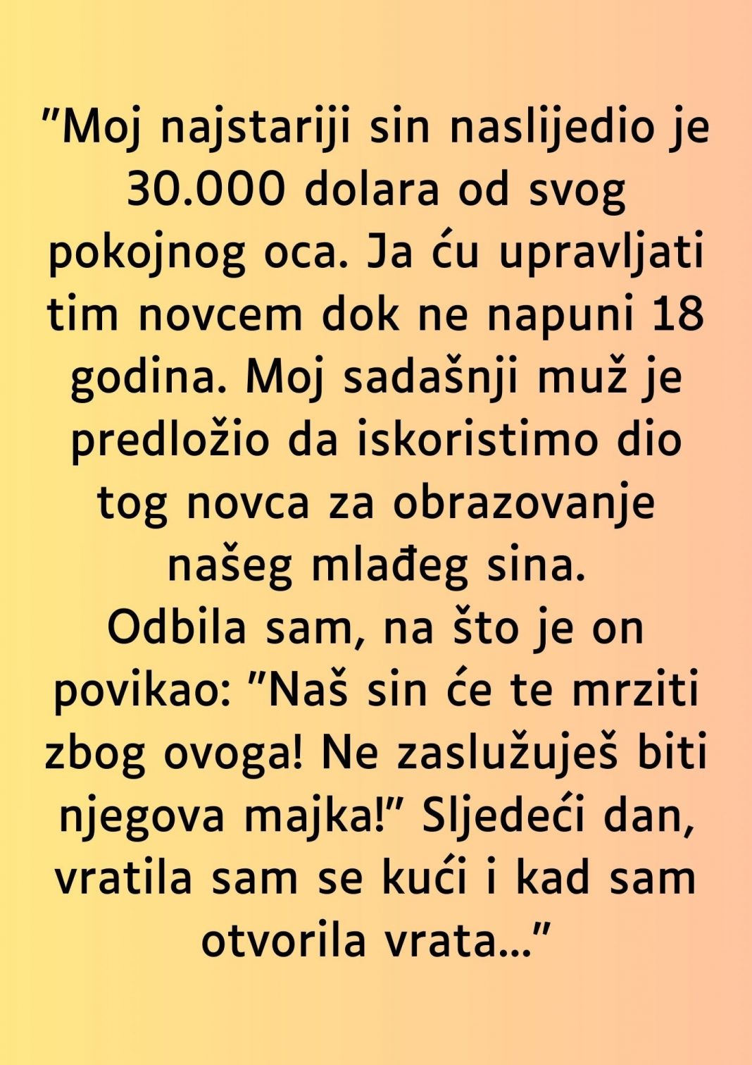 U današnjem članku pišemo o teškom i emotivnom iskustvu koje je doživjela žena koja se našla u situaciji kada je bila prisiljena donositi teške odluke o novcu koji je naslijedio njen sin. Ovaj članak donosi priču o obiteljskoj drami, sukobu interesa i, na kraju, dubokom razočarenju.