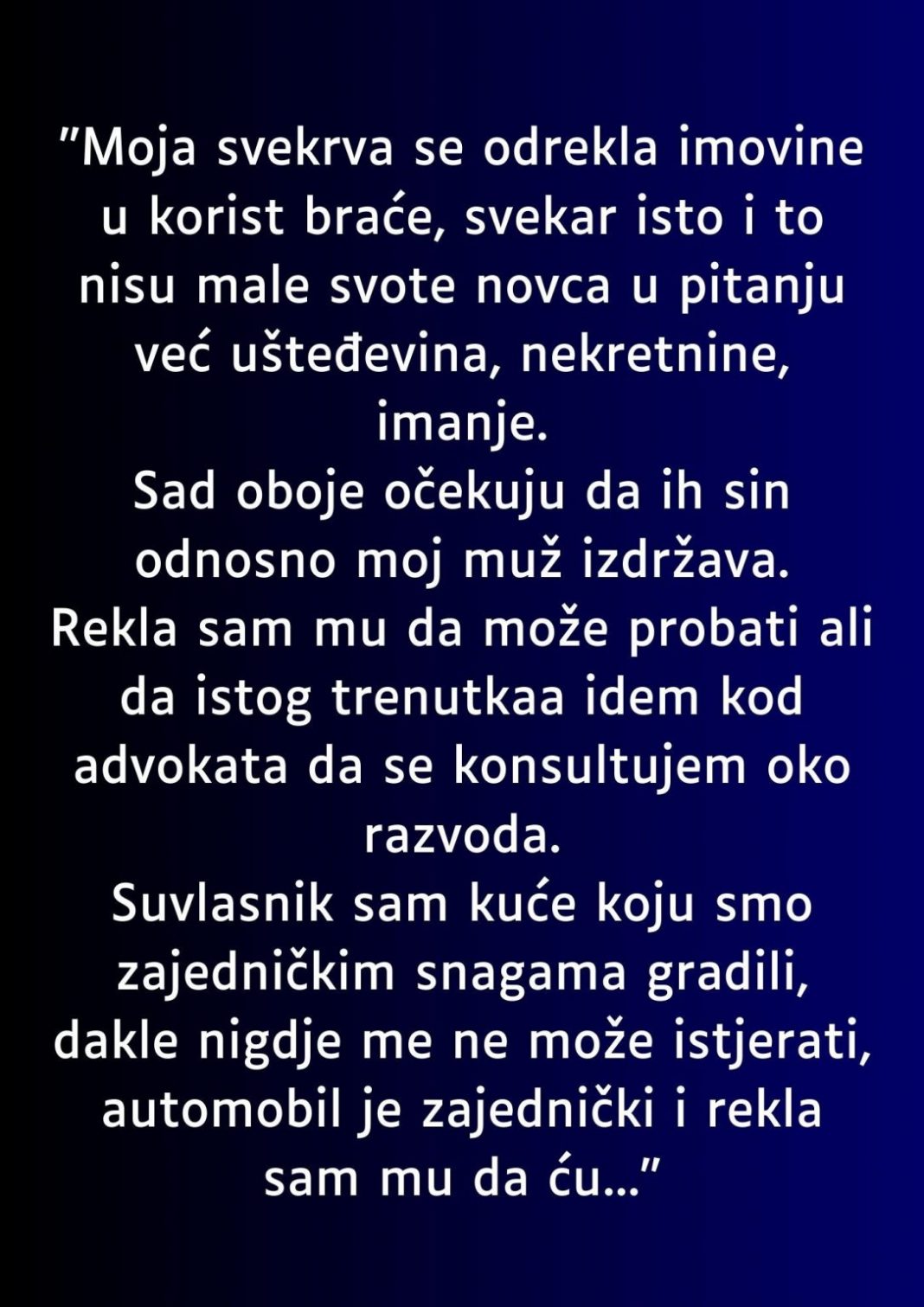 - Ona je svom mužu jasno stavila do znanja: ako smatra da treba da izdrži svoje roditelje, ona će odmah posetiti advokata i istražiti mogućnost razvoda. Ne želi da bude ničiji rob, niti da njen život bude uslovljen odlukama koje ona ne može kontrolisati. Istovremeno, ona ističe da je suvlasnik kuće koju su zajedno gradili, te da ne može biti istjerana niti da će se povući pred pritiscima. Isto tako, zajednički auto je deo njihove imovine i ona ne prihvata da sve što su postigli tokom godina bude narušeno zbog nerealnih očekivanja sa strane svekra i svekrve.