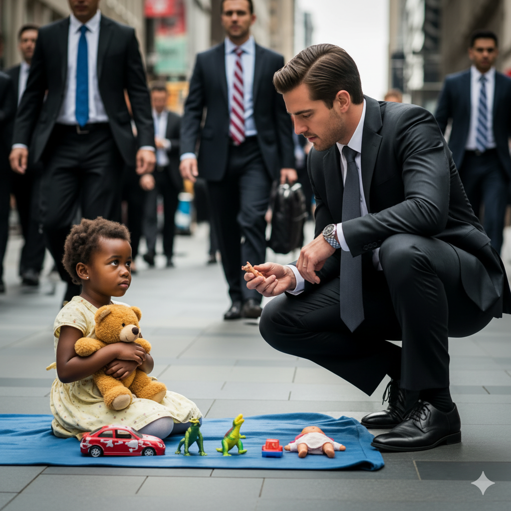 Na stepenicama jedne zgrade sjedila je mala djevojčica, stara možda sedam godina. Pred sobom je imala raširenu krpu na kojoj je stajalo nekoliko starih igračaka: pohabani plišani meda sa jednim okom, mala lutka, plastični dinosaur, izgrebani autić i ručno ušiveni zeka. Na svakoj igrački bio je zalijepljen papirić sa cijenom – od pedeset centi do jednog dolara.