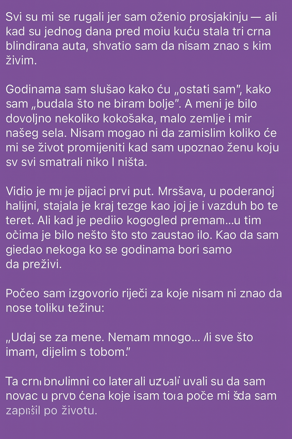 Danas, kada prođu selom, više ne čuje šapat iza leđa. Vidjeti kako ljudi poštuju njihovu porodicu donosi mu mir, ali još više ga raduje to što je njegova supruga ostala uz njega ne zbog obaveze, već zbog srca. Vjerovao je da luksuzni automobili tog dana nisu donijeli bogatstvo, već pravo lice istine — da je istinska vrijednost porodice u ljubavi, odanosti i hrabrosti da se izabere ono što srce prepoznaje kao dom.