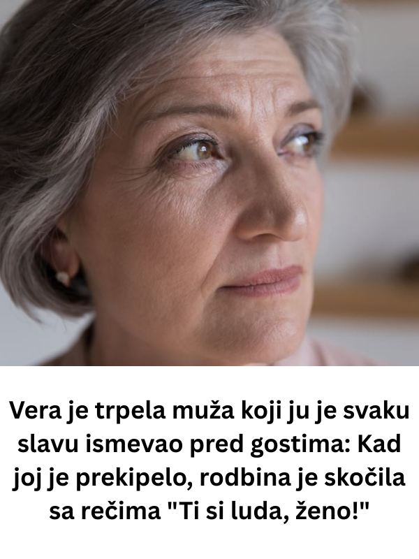 Vera je bila žena koja je godinama trpela. Njena svakodnevica bila je obeležena neprestanim šalama i kritikama njenog muža Igora pred njegovom porodicom. Svaka porodična proslava bila je samo još jedna prilika za Igora da se izruguje njenim “greškama” – zaboravljenoj kartici u prodavnici, presoljenoj hrani, zaboravljenoj pegli. Iako se smeh širio, Vera je, iz godine u godinu, osećala sve više kao deo tih šala.