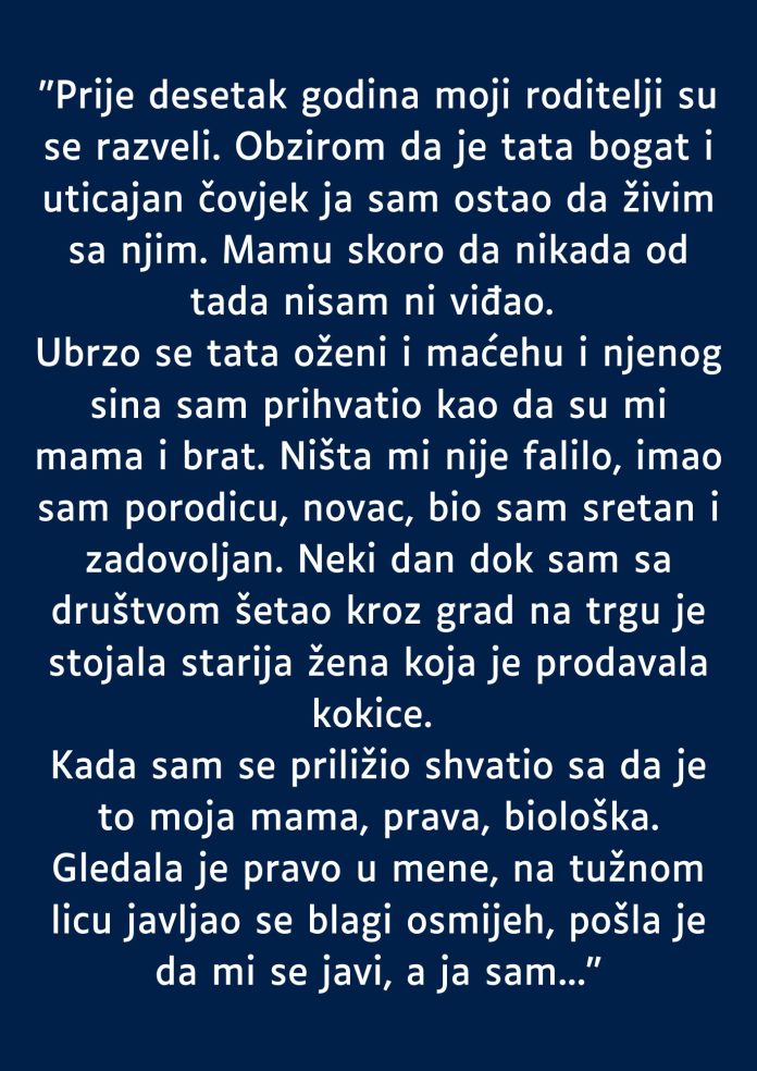 - Međutim, nedavno se dogodio jedan trenutak koji će zauvijek promijeniti moj pogled na sve. Išao sam sa svojim prijateljima na trgu, uživajući u šetnji, kad sam primijetio stariju ženu koja je prodavala kokice. Bilo mi je čudno jer je bila usamljenog izgleda i izgledala je pomalo zaboravljeno, kao netko tko ne pripada uokolo. Kad sam se približio, osjetio sam neki poznat osjećaj, a onda sam shvatio. To je bila moja biološka majka.